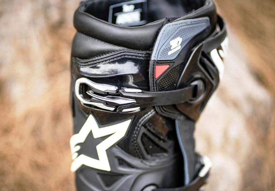 Alpinestars Tech 10 Enduro застёгиваются на три лёгкие полимерные пряжки и алюминиевую рамку с саморегулирующимися быстроразъёмными застёжками. Пряжки расположены в выемках с полиуретановой отделкой, которые защищают от ударов, способных их сломать или расстегнуть. Кроме того, у пряжек вращающееся основание, что предотвращает их отрыв в том случае, если одна из них случайно расстегнулась на ходу.