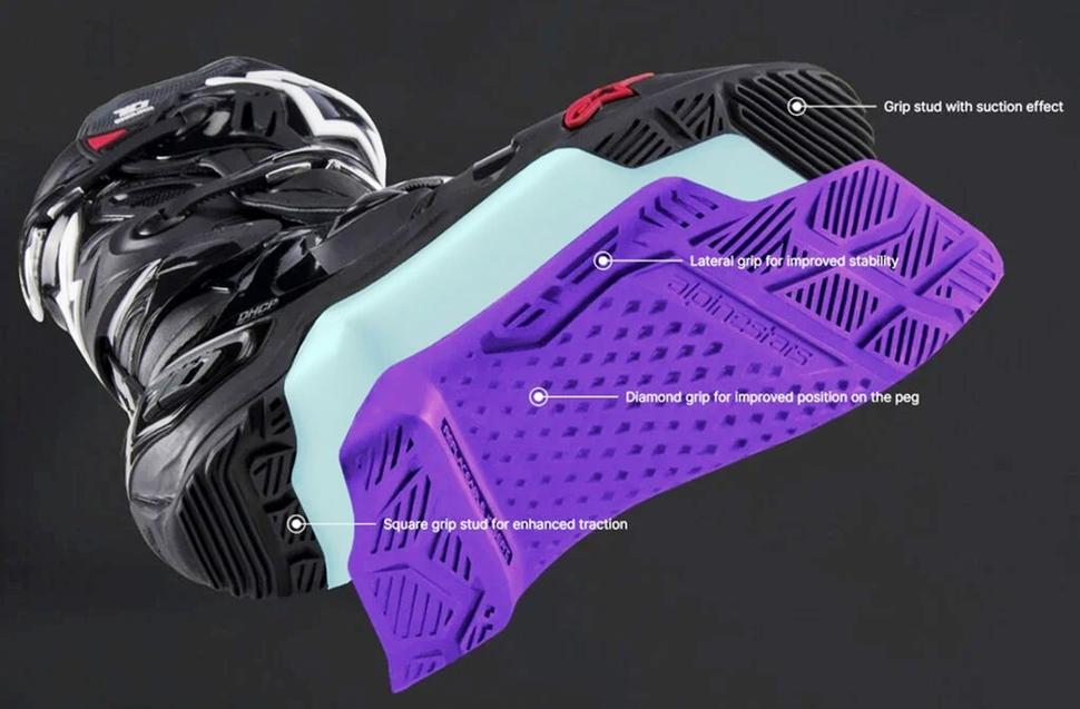 Одна из ключевых особенностей Alpinestars Tech 10 Enduro - новая конструкция подошвы. Большинство кроссовых ботинок имеют гладкую подошву, предназначенную для ухоженных трасс, но езда по бездорожью требует иного подхода. Там райдеру встречается и жидкая грязь, и скользкие камни, и неровности, и постоянное перекатывание и перетаскивание мотоцикла.