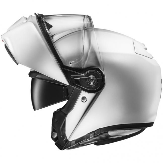 Изнутри HJC RPHA 90 выполнен на отлично: как я уже сказал, подкладка очень приятная на ощупь, плюс она разборная для возможности стирки. HJC не упоминает в своих материалах, что у шлема увеличен обзор по сравнению с предыдущим топовым модуляром, RPHA Max, но по факту обзор прекрасный, лучшего даже желать не надо. А встроенные очки длиннее и опускаются ниже, чем раньше. У меня под рукой не нашлось RPHA Max для сравнения, но могу точно сказать, что очки прекрасно закрывают глаза от солнца, не оставляя прямым лучам ни единой щёлочки.