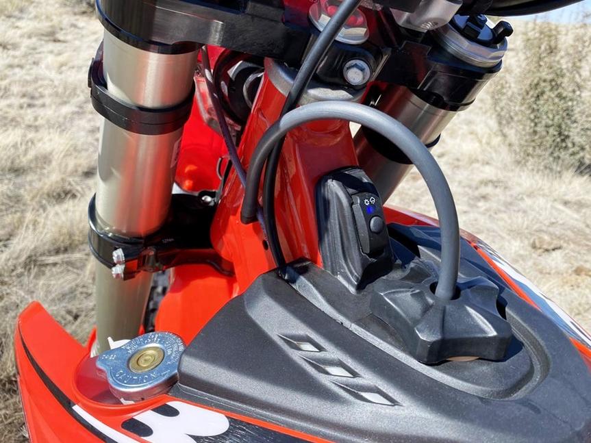 Beta 250 RR - это в первую очередь фановый мотоцикл, и в среднем темпе он едет лучше всего. Приятно, что производитель оснастил его двумя картами ЭБУ (зажигания, если быть точнее). Кнопка на передней части бензобака позволяет переключаться между режимом полной мощности (значок солнца) и режимом для дождя, который прилично приглушает отклик и мощность. Этот режим довольно удобен для затычных мест, типа сложных каменистых участков и глубоких бродов, так что он нужен не только под дождём.