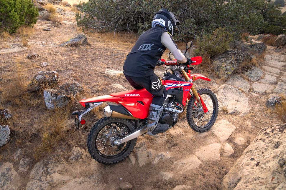 Помимо этих отличий (и новой, яркой графики) это всё тот же старый добрый универсальный мотоцикл двойного назначения (дуал-спорт) с 449,7-кубовым мотором Unicam, алюминиевой двухлонжеронной рамой и примерно 30 сантиметрами ходов подвесок от Showa. RL - единственная модель в семействе CRF450, омологированная для дорог общего пользования, и по сравнению с сородичами обладает более мягким характером благодаря другому распредвалу, широко разнесёнными шестью передачами и утяжелённым коленвалом для сдерживания характера и лучшей тяговитости.