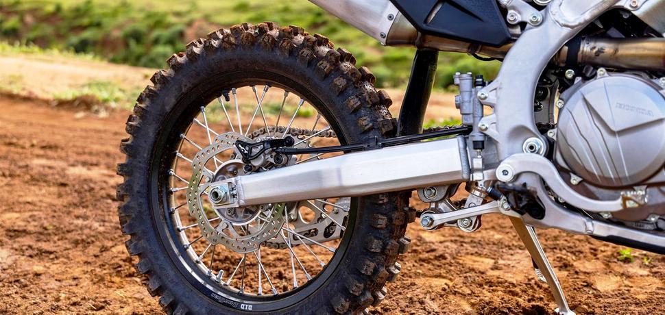 Сзади стоит 18-е колесо, более подходящее для эндуро. Колёса размерами 90/90-21 и 120/90-18 делают CRF450RX более комфортной, особенно заднее по сравнению с кроссовой версией с 19-м колесом.