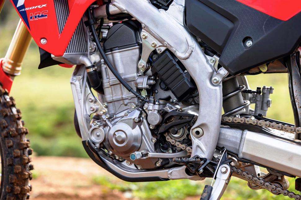 450-кубовый мотор Honda Unicam по своей конструкции чрезвычайно универсален. Он стоит как на CRF450RX, так и на моделях CRF450R и 450RWE. Он не только резкий и мощный, но и гибкий, отлично поддаётся тюнингу и отлично отзывается на разные стили езды. Может спокойно тащить на низах на высокой передаче - достаточно просто чуть задрать холостые и иногда помогать чётким гидравлическим сцеплением Nissin.