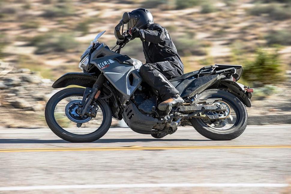 На грунте это даёт ощущение большей устойчивости, которому способствует и более низкий центр тяжести. При агрессивной езде Kawasaki KLR650 S меньше раскачивается и козлит на буграх, меньше дёргается и рыскает на неровностях. Интересно, что в регулировке задней подвески необходимости не возникло ни разу: она действительно периодически складывается полностью, когда KLR приземляется после прыжка или едет по песчаной гребёнке с азартом хард-эндуро, но когда KLR650 S в своей стихии и придерживается своих сценариев езды, он работает практически идеально. Он легко входит в повороты, хорошо ведёт себя в колеях и на упорах, амортизатор плавно выбирает доступный ход, постепенно становясь всё более жёстким по мере складывания, а затем даёт предсказуемый и мягкий отскок.