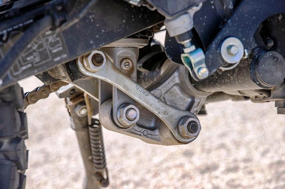 Также подвески Kawasaki KLR650 S получили рассчитанные специально для этой модели пружины и внутренние клапаны, чтобы доступные ходы использовались максимально эффективно и при этом сопротивлялись пробою. Kawasaki заявляют, что сумели достичь той же эффективности зацепа на заднем колесе, что и у моделей стандартной высоты. Здесь имеется в виду способность подвески держать колесо на грунте, без лишних подпрыгиваний отслеживая и отрабатывая неровности рельефа, и достигли они этого благодаря тому, что увеличили длину рычага подвески Uni-Trak на 4мм для оптимизации угла наклона маятника.