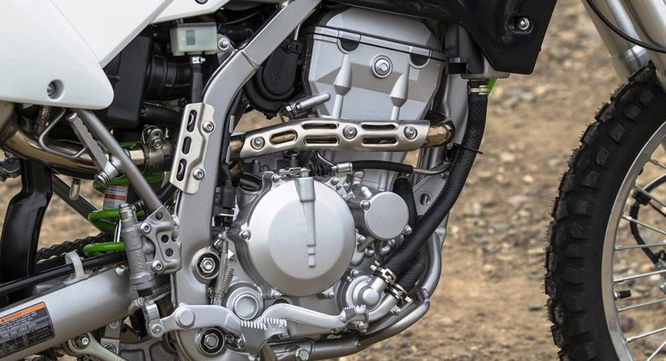 Его ГРМ имеет те же профили кулачков, что и у его внедорожного брата KLX300R, и вкупе с лёгким плоским поршнем, степенью сжатия 11,1:1 и инжекторной системой питания, он выдаёт удобную, доступную низовую тягу. Передачи и трансмиссия очень дружественны, и лёгкие касания рычага сцепления с рывком газом легко позволяют KLX забираться на камни и выбираться из рытвин.