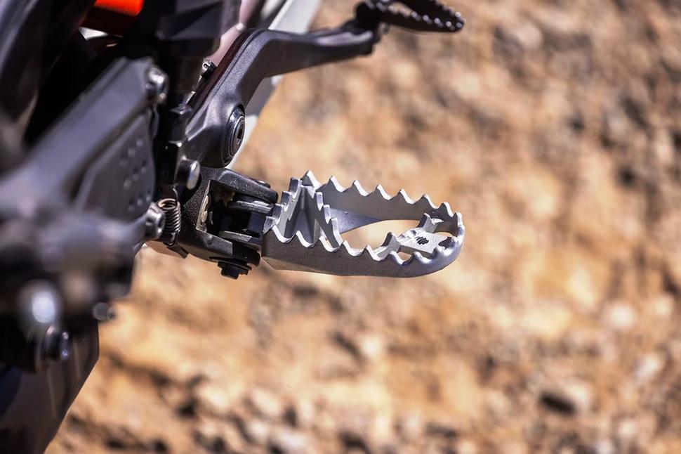Длинное седло кроссового вида на удивление удобное, широкое и с хорошей поддержкой. Наверное, вообще лучшее из всех современных дуал-спортов, хоть и широковато между коленями. Широкие зубастые подножки дают отличный зацеп и поддержку для внедорожной езды, к тому же они имеют регулировку (2 положения), хоть и установлены высоковато для увеличения клиренса, поэтому несколько снижают комфорт для высоких райдеров.