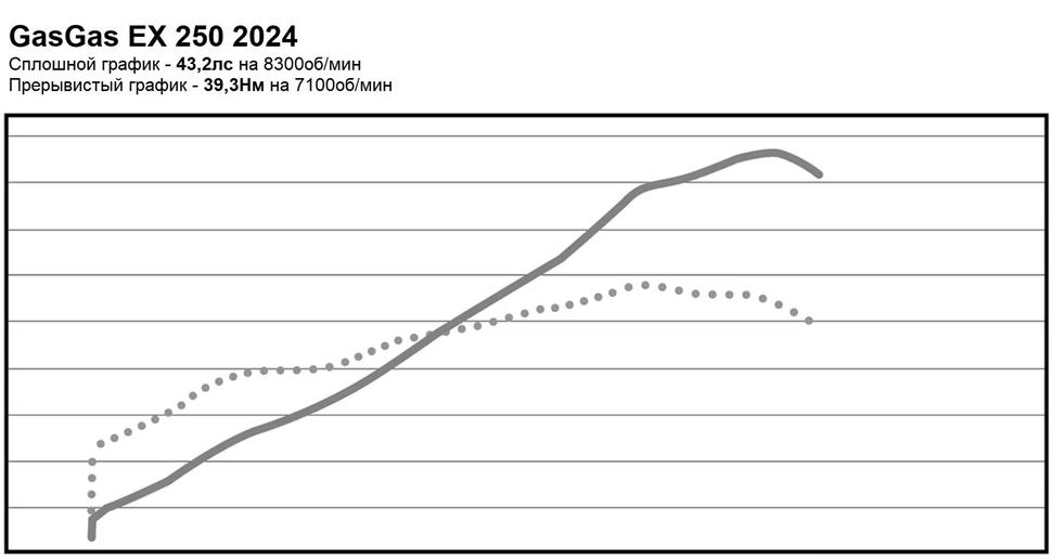 Пошло ли это на пользу? Судите сами: на диностенде двухтактный кросс-кантри GasGas EX 250 2024 года показал пиковые 43,2лс на 8300об/мин и 39,3Нм на 7100об/мин с колеса.