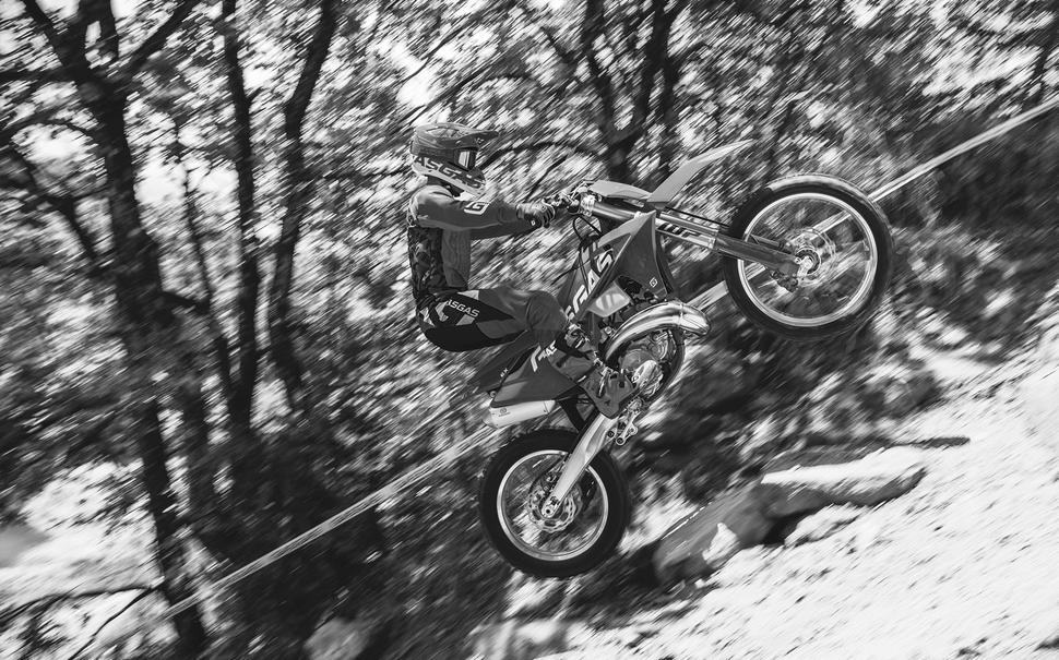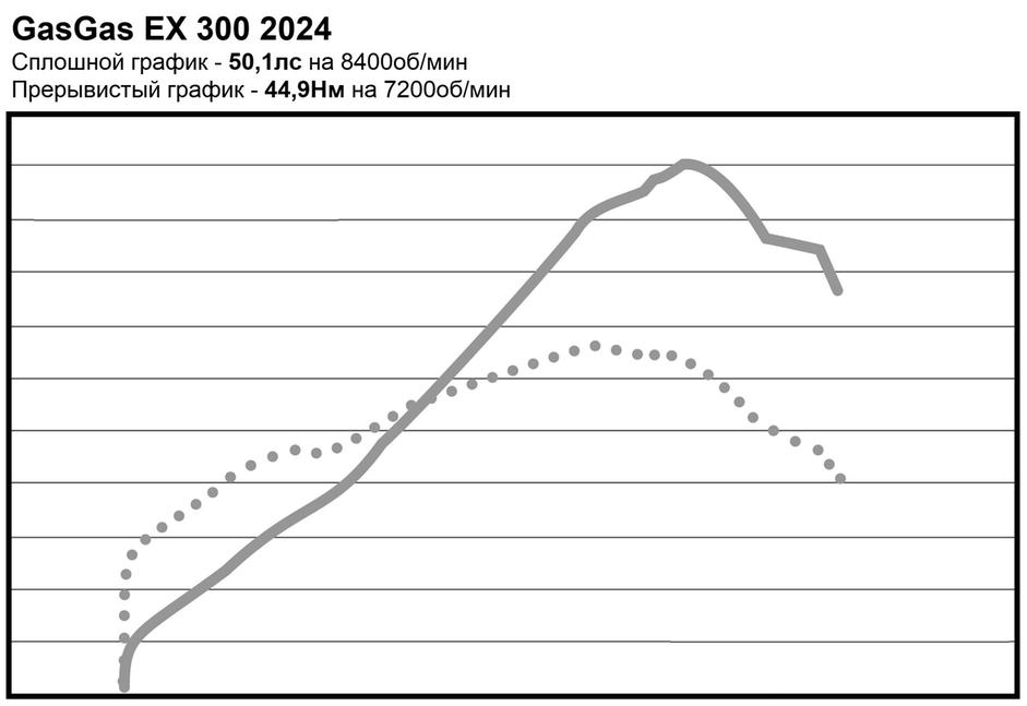 Обновлённый EX 300 не только впечатлил на тестовой трассе, но и неплохо показал себя на диностенде. Его инжекторный 293-кубовый одноцилиндровый двухтактный мотор жидкостного охлаждения, настроенный для кросс-кантри, выдал 50,1лс на 8400об/мин и 44,9Нм на 7200об/мин с колеса. Таким образом, GasGas EX 300 по производительности не так уж сильно отстаёт от четырёхтактных 450-кубовых кроссовых моделей, а по крутящему моменту даже превосходит, к примеру, Kawasaki KX450 2024 года.