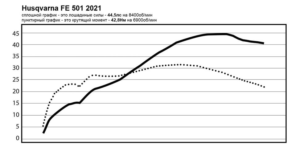 Самая кубатурная модель эндуро в линейке Husqvarna, FE 501, разумеется, является и самой мощной. Она выдаёт 44,5лс на 8400об/мин, что на 8лс больше, чем выдала FE 350 на том же диностенде, на 0,7лс больше двухтактной инжекторной TE 300i, и на 3,8лс больше TE 250i. Что касается крутящего момента, FE 501 выдаёт 42,8Нм на 6900об/мин, и это на 13Нм больше, чем у FE 350, почти на 6Нм больше, чем у TE 300i, и на 5,5Нм больше, чем у TE 250i