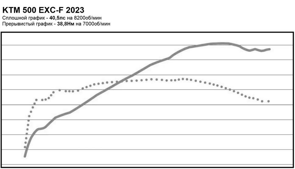 KTM 500 EXC-F 2023 года с задним колесом, обутым в дорожную шину, был водружён на диностенд. Его инжекторный четырёхтактный двигатель с одним верхним распредвалом, имеющий рабочий объём 511куб.см, выдал 40,5лс на 8200об/мин и 38,8Нм на 7000об/мин. Эти пиковые значения сравнимы с KTM 250 SX-F 2023 в случае мощности и с KTM 350 XC-F 2022 по крутящему моменту, но сочетание линейной, доступной мощности и ровной полки момента делает этот мотоцикл чрезвычайно удобным как для грунта, так и для асфальтовых путешествий.