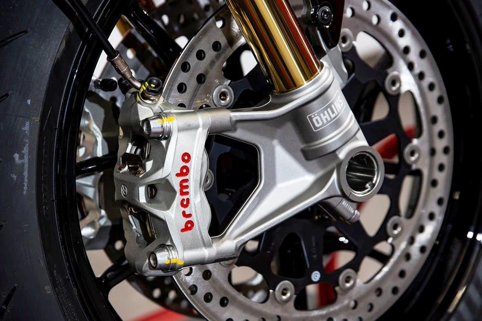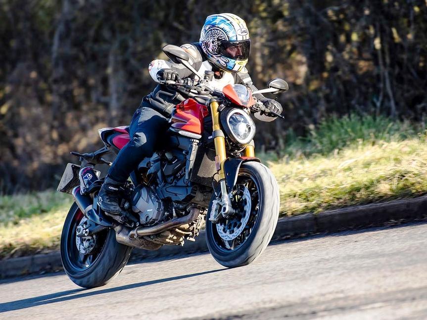 Сниженная неподрессоренная масса благодаря топовым суппортам Brembo и алюминиевым колёсам в сочетании с более лёгкой вилкой Ohlins NIX30 придаёт Monster лёгкость руления и на удивление мягкий ход. Информативность тормозного рычага великолепна, а ABS имеет отдельный режим, в котором работает только на переднем колесе, давая возможность дрифта, или может быть полностью отключена. Трекшн-контроль имеет аж восемь ступеней и тоже может быть полностью отключен.