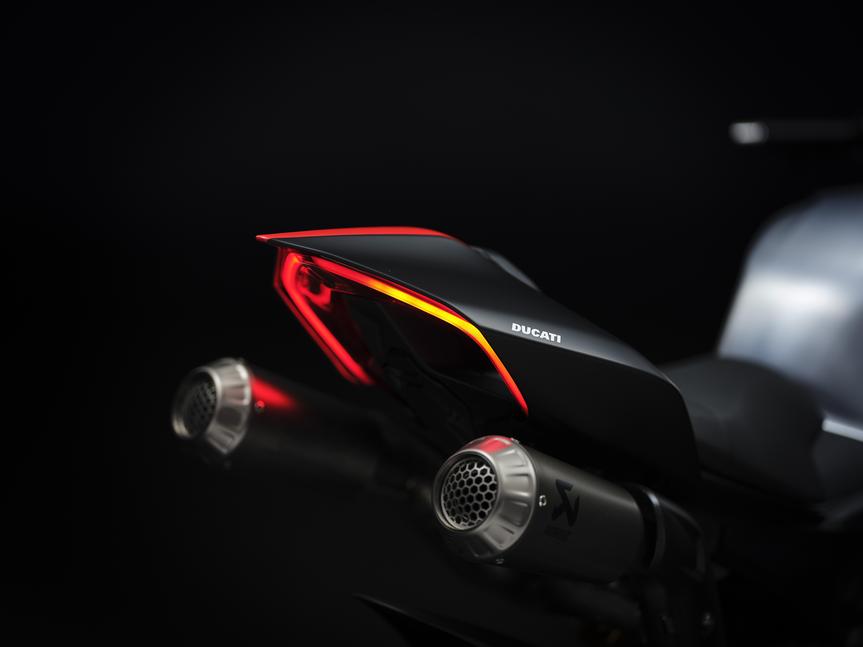 Как и на Panigale V4, точка расположения шарнира маятника была перенесена вверх на 4мм, что позволяет более эффективно справляться с приседанием на ускорениях, делая мотоцикл более стабильным и точным в управлении и позволяя сохранять траекторию при выходе из поворотов и в целом в любых ситуациях с ускорением.