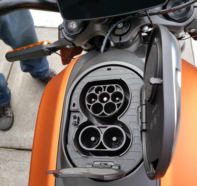 Harley Davidson может быть и считают мотор Livewire центральным элементом мотоцикла, но по мне первый взгляд привлекает фальшбак. В данном случае он является местом расположения зарядного порта. Этакий современный взгляд на классический бак-"орех", крышка которого открывает доступ к гнёзду J1772 и порту быстрой зарядки постоянным током. Через последний пустая батарея может взять 80% своей ёмкости за 40 минут. Полная зарядка занимает час. Самый медленный способ зарядки - комплектный зарядник Level 1, вставляющийся в стандартную розетку и заряжающий батарею за 10 часов. Он хранится под сиденьем мотоцикла.