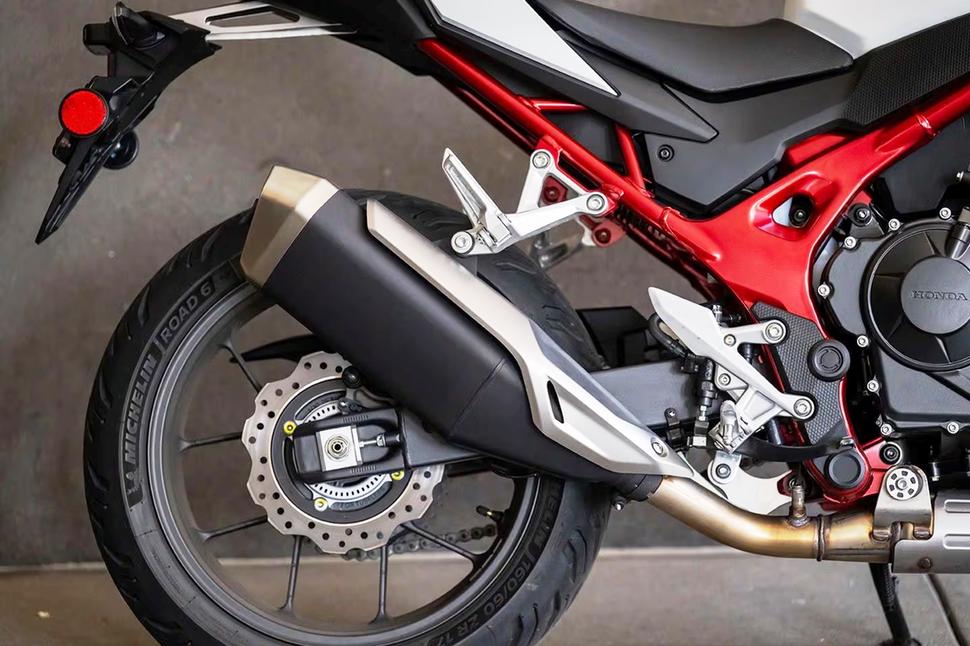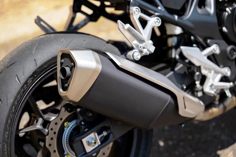 Рабочий объём двигателя Honda CB750 Hornet 2025 составляет 755куб.см. Диаметр цилиндров составляет 87,0мм, а ход поршней - 63,5мм. Как и многие рядные двойки (в том числе у Honda), этот двигатель имеет 270-градусную фазировку коленвала с неравномерным порядком вспышек, который имитирует характер V-твина. Цилиндры имеют покрытие из карбида кремния-никеля (Ni-SiC), как у CBR1000RR-R. Степень сжатия - достаточно умеренная, 11,0:1. Как и моторы Africa Twin и NT1100, двигатель Hornet имеет конструкцию Unicam, то есть, оснащён одним верхним распредвалом, который приводит по паре 35-миллиметровых впускных и 29-миллиметровых выпускных клапанов на цилиндр. Двигатель оснащён парой 46-миллиметровых дроссельных заслонок с электронным управлением PGM-FI. Характеристики производительности для обновлённого Hornet пока не объявлены. Ещё одной интересной особенностью этой модели, отличающей её от других с подобной конфигурацией двигателя, является выхлопная система традиционной конструкции с одним глушителем на правой стороне мотоцикла.