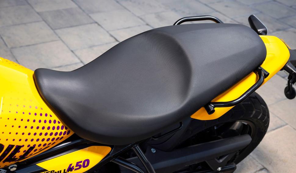 В седле Guerilla 450 вполне удобно даже с ростом 185см и весом 97кг. Посадка продуманная, расслабленная и вертикальная, позволяет легко переносить вес при энергичной езде или менять положение, чтобы слегка размяться на ходу. Подножки среднего расположения оставляют неплохой запас углов наклона, не заставляя поджимать ноги.
