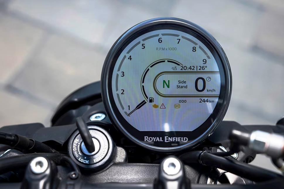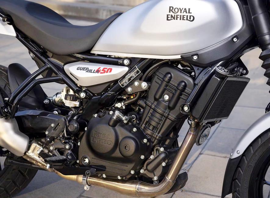Учитывая огромные усилия, которые Royal Enfield приложили к разработке обновлённого Himalayan нового поколения, неудивительно, что некоторые из заложенных в него идей перекочевали и в Guerilla 450. Фактически, эти две модели разрабатывались параллельно. Известно, что двигатель Guerilla - тот же, что и у Himalayan, то есть, 452-кубовый одноцилиндровый с двумя верхними распредвалами, четырьмя клапанами и жидкостным охлаждением. Производительность Royal Enfield Guerilla 450 тоже аналогичная - 39,5лс на 8000об/мин с коленвала и 40Нм на 5500об/мин. Он оснащён шестиступенчатой коробкой и проскальзывающим сцеплением с лёгким выжимом, но при этом размер задней звезды отличается. Впрочем, это как раз понятно с учётом дорожного предназначения Guerilla.