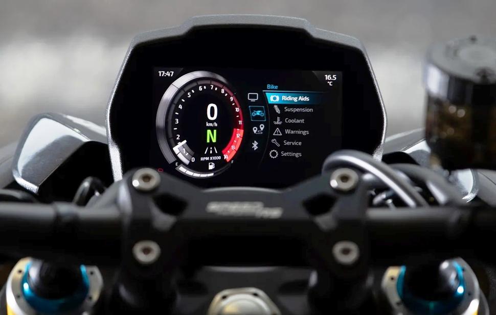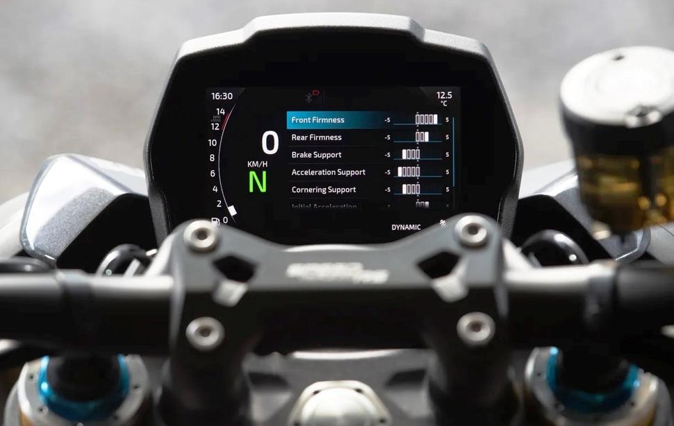 Всё это управляется через 5-дюймовый TFT-дисплей, такой же, как на прошлой модели, и с тем же интерфейсом. Он, кстати, довольно ощутимо подтупливает, и Triumph следовало бы задуматься о меню быстрого доступа, как у Ducati, Aprilia и Yamaha, потому что различных настроек подвесок и электроники уже столько, что в них легко запутаться. Спасение в том, что открытое подменю не закрывается автоматически, и можно на ходу, например, возиться с настройками подвесок. Но лучше просто переосмыслить интерфейс приборки, а заодно - увеличить шрифт на экране.