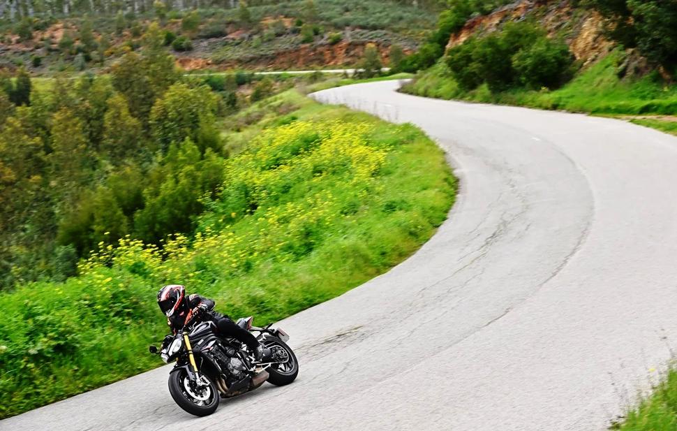 Дождевые шины с канавками ёрзают сильнее сликов, так что выяснить, протестует ли шасси, или шина делает своё дело, легко: достаточно пошаманить с электронными настройками подвесок. Но Triumph сохраняет приятную управляемость, чётко информируя о любом проскальзывании или заносе с точностью обычного спортбайка.