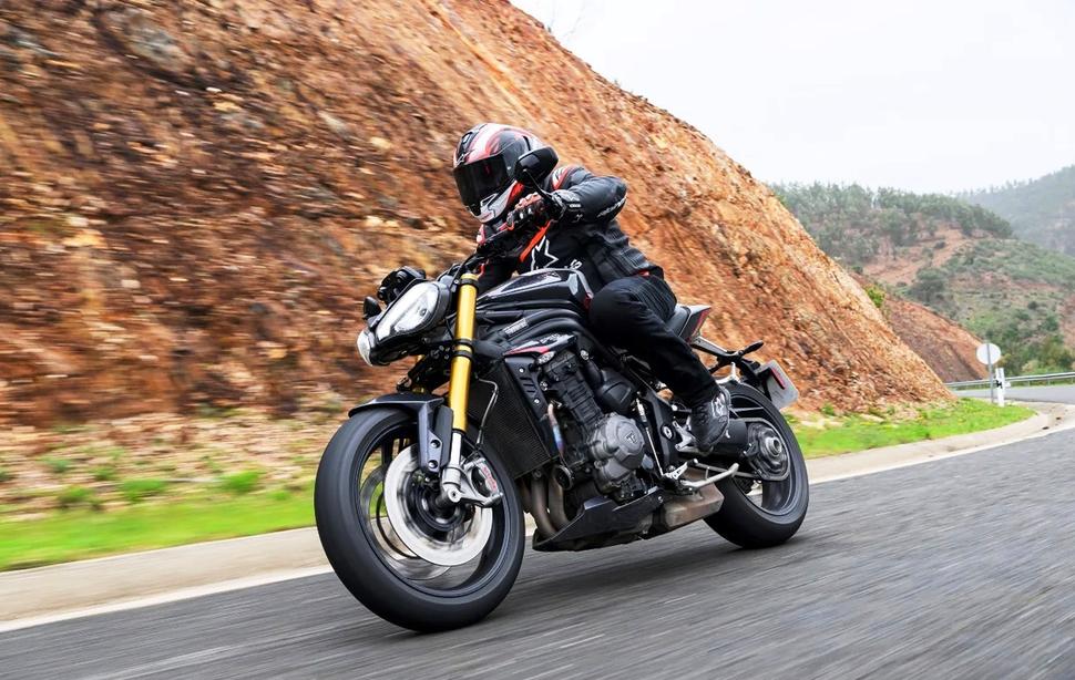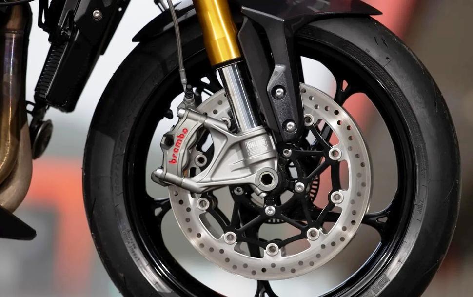 Хотя, как сказать: электронная регулировка на полуактивных подвесках Ohlins Smart EC3 использует новейшую технологию золотниковых клапанов в вилке NIX30 и амортизаторе TTX36, которые пришли на замену традиционным игольчатым клапанам прошлого. Новые подвески срабатывают быстрее, создавая более широкое окно регулировки. И это хорошо, потому что они более эффективно отрабатывают обратную связь с поверхности дороги, положение ручки газа и углы наклона, обещая более плавный ход на дороге и более чёткую реакцию на треке. А ещё их наличие значит, что Triumph Speed Triple 1200 RS 2025 присоединился к клубу "Smart Ohlins", в который входят Honda CBR1000RR-R SP Fireblade 2024 года (28999 долларов), Ducati Panigale V4 S 2025 года (33895 долларов) и Ducati Streetfighter V4 S 2025 года (29295 долларов). Обратите внимание на ценники: все они прилично выше, чем у Triumph.