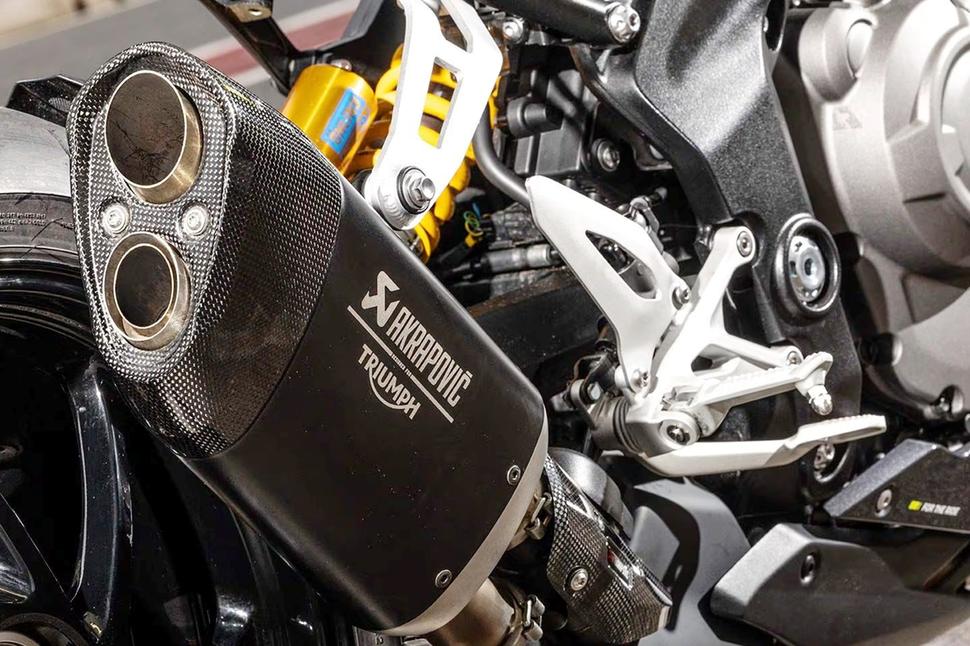Новый титаново-карбоновый глушитель Akrapovic соответствует Euro 5+, но бурчит и рычит весьма солидно, делая мотоцикл более спортивным. На фоне массивного глушителя RS, который раньше будто бы был частью заводской системы подготовки воздуха, это плюс.