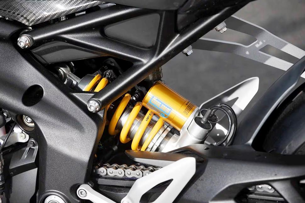 Ключевое отличие RS и RX - рулевой демпфер Ohlins SD16 на RX с электронным управлением вместо обычного механического Marzocchi на RS. Преимущество электронной системы в том, что Ohlins постоянно отслеживает условия езды и реагирует соответственно. При езде по пит-лейну или по городу демпфер работает на минималках, делая рулевое управление мягче. По мере роста скорости растёт и сглаживание хода руля, а на неожиданное и резкое движение он реагирует мгновенным затягиванием жёсткости, тем самым гасит вобблинг и толчки от неровностей. Система управления подвесками и демпфером руля подключена к OBTI и постоянно меняет настройки, реагируя на характер езды и дорожную обстановку.