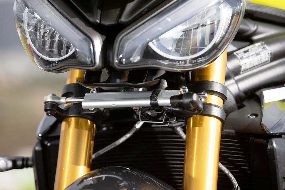 Трек, на котором проходили испытания Speed Triple 1200 RX, представляет собой прекрасное место для изучения возможностей электронной регулировки демпфера и подвесок. Его сумасшедшие гребни и неровности постоянно стремятся разбалансировать живое и манёвренное шасси. Но ни одна попытка вызвать вобблинг не увенчалась успехом: RX был невозмутим. Новейшая система Ohlins EC3 с золотниковыми клапанами даёт быструю и точную регулировку с широким диапазоном. Даже при приземлении из полуслучайного вилли шасси сохранило собранность. Несмотря на манёвренность в поворотах, RX всегда уверенно держит траекторию там, где надо.