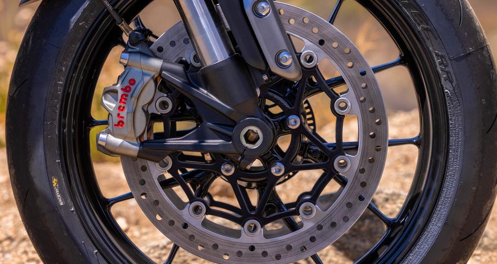 Итак, Triumph Speed Twin 2022 года: перевёрнутая 43-я вилка Marchocchi, несущая радиальные моноблочные суппорта Brembo M50 на больших 320-х дисках. Ход обеих подвесок остался прежним, 12см, но задняя подвеска тоже получила более качественные компоненты. Кроме того, обновлённая версия получила новые 12-лучевые легкосплавные диски.
