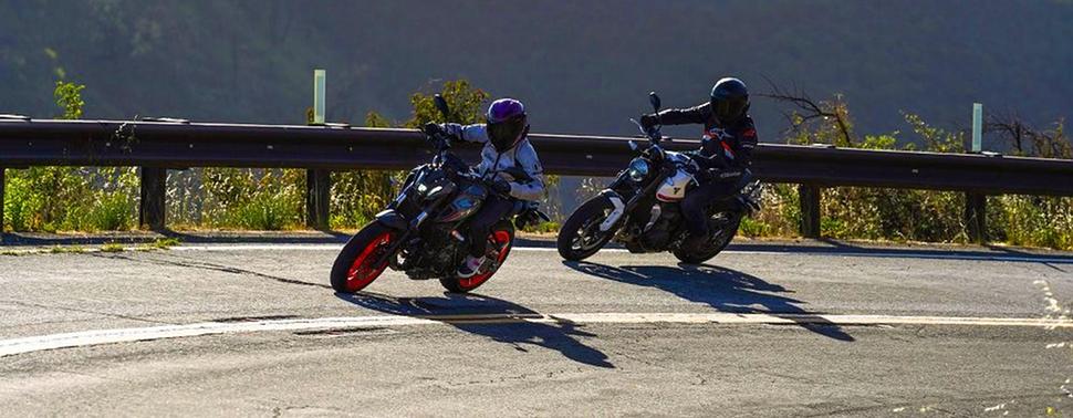 Yamaha в свою очередь более легконогая и намного охотнее закладывается, но далеко не так уверенно держит линию. Добавьте сюда дёрганный газ и рывки в трансмиссии - и станет ясно, что этот мотоцикл безусловно сложнее управляется, независимо от уровня навыков райдера. На сложной дороге с плохим асфальтом в поворотах Triumph запросто и без особых усилий уезжает от MT-07, собранный и несколько самодовольный.