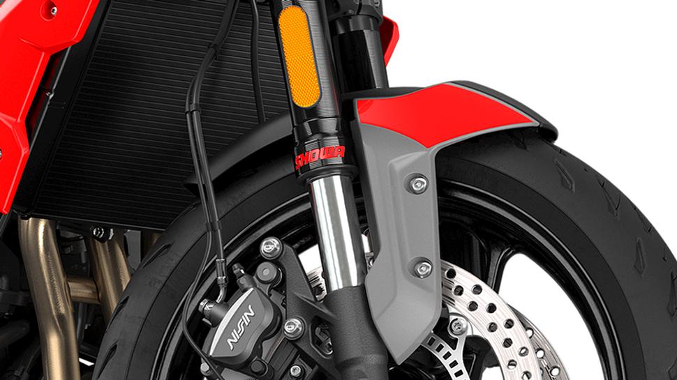 И в то же время Triumph ухитряется примерно в ту же сумму заложить нормальные современные подвески со стопками шайб в раздельной вилке, где одно перо имеет дело со сжатием, а второе с отбоем. Не особо-то и сложная конструкция, даже регулировок не имеет, но держит отлично, управляется прекрасно, не клюёт на торможениях и чётко удерживает траекторию в поворотах.