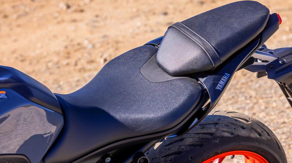 Что касается эргономики в целом, я бы назвал Yamaha MT-07 стандартным дорожником с чуть более спортивной посадкой. Чуть больше изогнуты колени при нейтральном расположении подножек, чуть сильнее наклон к широкому рулю - и получается не столько агрессивная, сколько собранная посадка, практически нейтральная, но удобная на резких ускорениях и торможениях. Более высоким людям может быть неудобно в плане изгиба коленей, но в остальном MT-07 вполне комфортен для разных ростовок.