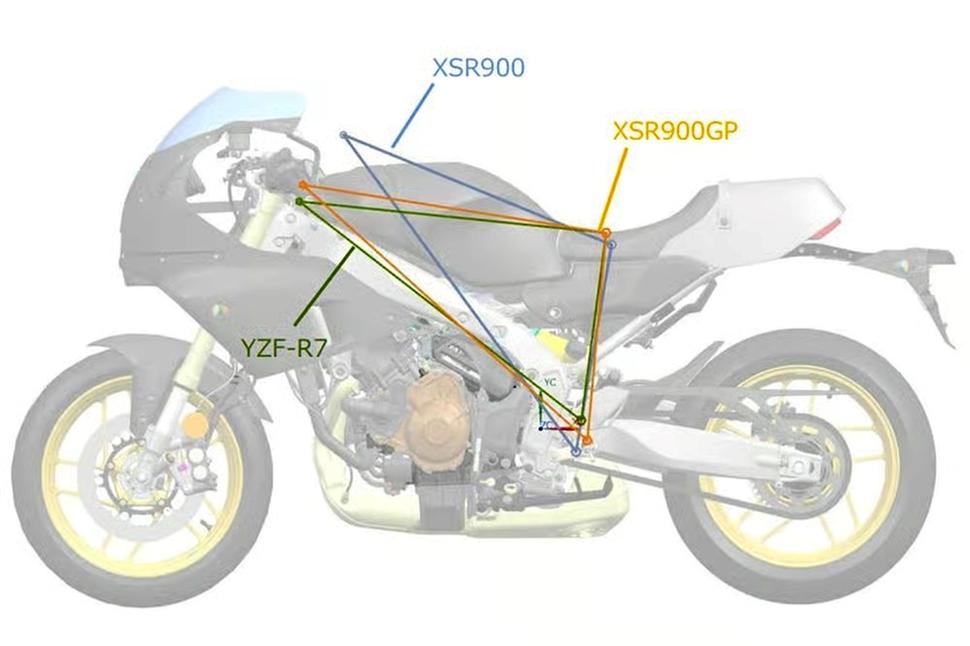 Зачастую одно изменение влечёт за собой другие. Так и в случае с геометрией GP: хотя её размеры близки к размерам нейкед-версии XSR900, они не идентичны. Угол вилки остался равным 25 градусам, а трейл увеличился со 107 до 110мм. Колёсная база подросла с 1495 до 1500мм, то есть, стала такой же, как у Tracer 9.