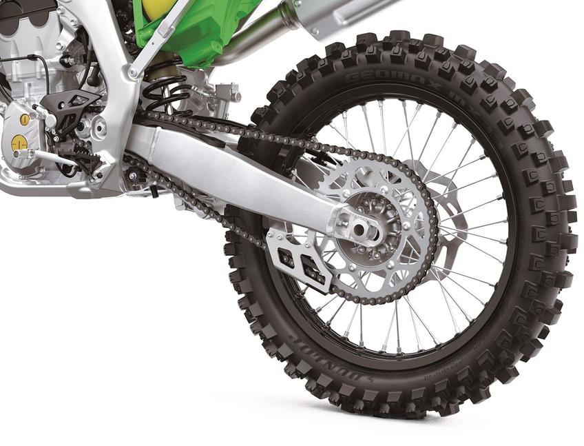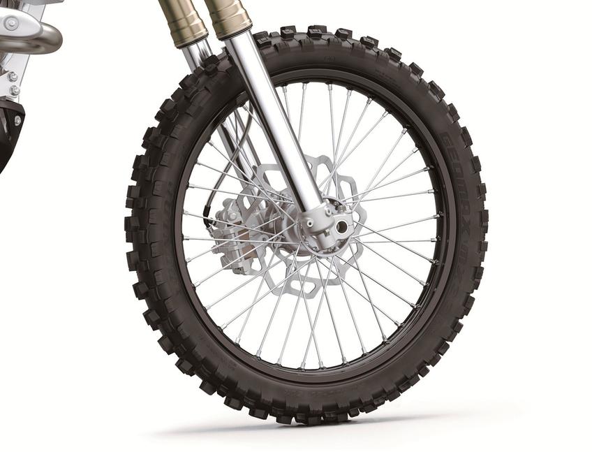 Переднее колесо KX250 обуто в резину размером 80/100-21, а заднее - в более широкую 110/90-19.
