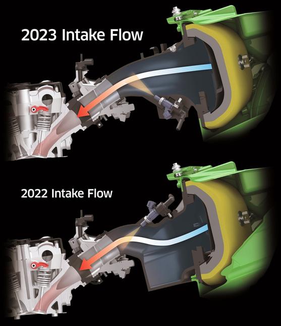 На входе в аирбокс стоит короткая впускная воронка, повышающая производительность на высоких оборотах. Кроме того, Kawasaki KX250 стал первым серийным кроссовым мотоциклом с двумя форсунками на цилиндр. Нисходящий поток форсунки у дроссельной заслонки обеспечивает плавный быстрый отклик на газ, а вторая форсунка с восходящим потоком, расположенная рядом с аирбоксом существенно повышает эффективность работы на высоких оборотах. В версии 2023 года впуск с нисходящим потоком стал прямее, а вторая форсунка была перемещена под выходной патрубок аирбокса.