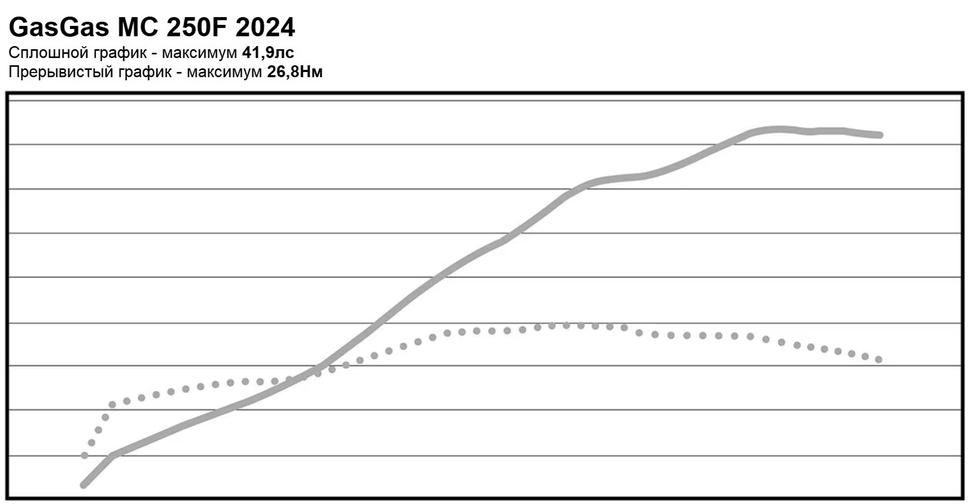 GasGas MC 250F 2024 года демонстрирует небольшой прирост на низах, и куда более заметное повышение мощности на средних и высоких оборотах, что вполне логично с учётом верхового характера этой 250-кубовой кроссовой модели.