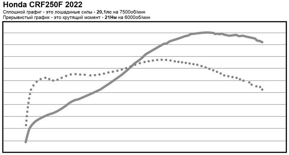 На диностенде нынешняя версия CRF250F выдаёт 20,1лс на 7500об/мин и 21Нм на 6000об/мин. При этом уже с двух с половиной тысяч оборотов и вплоть до 8 с лишним тысяч оборотов в минуту этот мотор выдаёт довольно ровную полку момента не ниже 16Нм, показав небольшой провал чуть ниже 3000, связанный, вероятно, с экологическими требованиями.