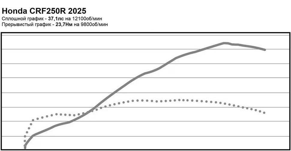 Учитывая, что основная тяга у неё внизу, CRF250R - не самая мощная кроссовая четырёхтактная 250-ка. Но обновления 2025 модельного года, включая новый аирбокс, новые карты ЭБУ, увеличенную жёсткость коленвала и более прямой выпускной тракт, повысили производительность двигателя даже больше, чем ожидалось. Что касается пиковых показателей на диностенде, то Honda CRF250R 2025 года показала с колеса 37,1лс и 23,7Нм тяги на 12100 и 9800об/мин соответственно.
