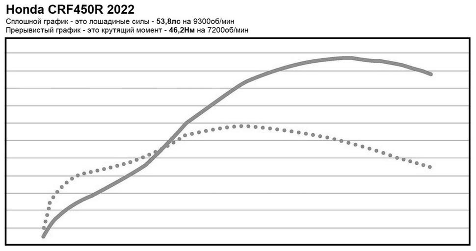 Причём если в прошлые годы CRF450R безраздельно властвовала на диностенде среди стандартных кроссовых 450к, то теперь её потеснили KTM 450 SX-F и GasGas MC 450F 2022 года. Впрочем, разница в цифрах там гомеопатическая: Honda CRF450R 2022 года выдаёт 53,8лс на 9300об/мин, в то время как пик мощности KTM равен 55лс на 9400об/мин, а у GasGas - 54лс на 9600об/мин. Что же касается пика крутящего момента, то со своими 46,2Нм на 7200об/мин Honda наступает на пятки KTM - тот выдаёт 46,5Нм на 7500об/мин. Но что самое любопытное - CRF450R на ходу почему-то ощущается более быстрым мотоциклом, чем SX-F.