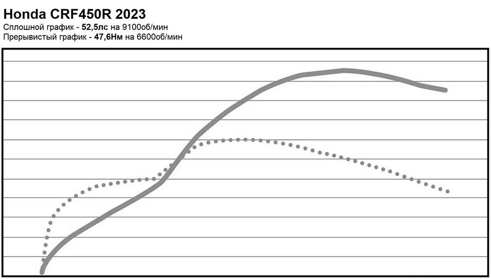 Honda CRF450R 2023 года с задним колесом, обутым в асфальтовую шину, на диностенде показала пиковые 52,5лс на 9100об/мин. Это не самая высокая мощность среди одноклассников 2023 модельного года, но при этом по тяге CRF вновь вышла на первое место среди них, показав пик крутящего момента в 47,6Нм на 6600об/мин.