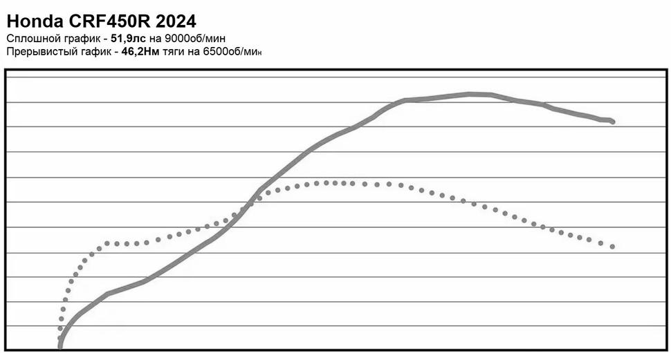Honda CRF450R 2024 года по механической части идентична модели предыдущего года. На диностенде этот мотоцикл выдал 51,9лс на 9000об/мин и 46,2Нм тяги на 6500об/мин. На фоне одноклассников Honda CRF450R не может похвастаться значительной мощностью, а вот тяга у неё достойная, выше значение крутящего момента только у одного соперника. По характеру двигатель Honda CRF450R 2024 - нечто среднее между высокооборотистыми и низовыми моторами, тяговитый и достаточно крутильный, а уменьшение диаметра дроссельной заслонки на модели 2023 года оказалось верным решением, потому что мотор теперь может похвастаться очень чётким и резким откликом на ручку газа.