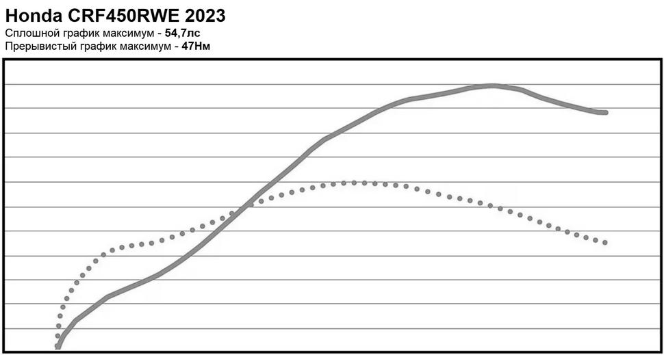 Honda CRF450RWE 2023 года, обутая в дорожную резину, на диностенде показала пиковые 54,7лс и 47Нм тяги. Относительно базовой модели прирост мощности составил 2,2лс, а вот максимальный крутящий момент при этом просел на 0,55Нм.