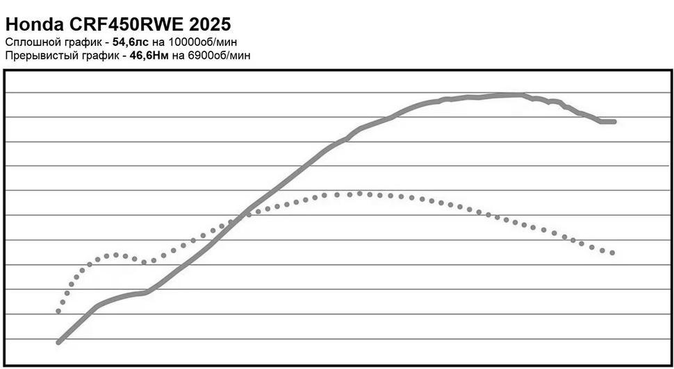 На диностенде Honda CRF450RWE 2025 года показала пиковые 54,6лс на 10000об/мин и 46,6Нм на 6900об/мин. По сравнению с базовой моделью RWE производит больше мощности и тяги на участке с 3000 до 3400об/мин и с 4200 вплоть до отсечки в районе 11500об/мин.