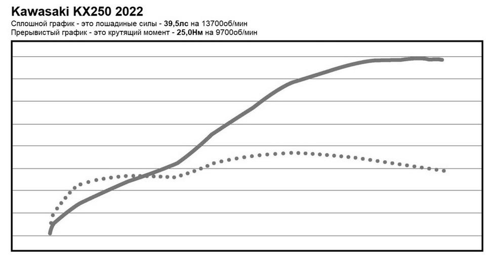 На диностенде KX250 выдал 39,5лс на 13700об/мин и 25,0Нм на 9700об/мин. На этом же диностенде GasGas MC 250F выдал точно такую же пиковую мощность и на 0,4Нм больше тяги.