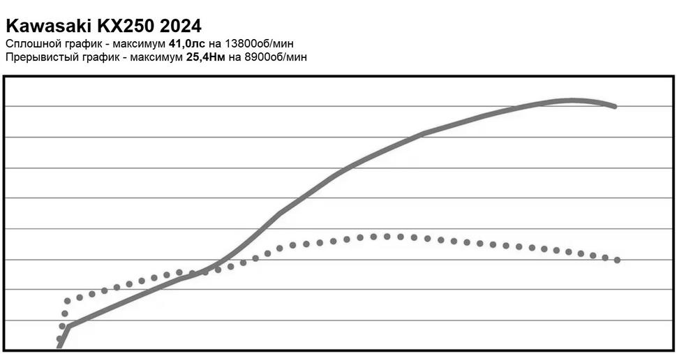 Что касается пиковой мощности, то Kawasaki KX250 ещё с 2020 года показывает на диностенде довольно конкурентные цифры. Однако, с тех же пор он подвергается критике за недостаток тяги на низах, что стало побочным эффектом стремления японского производителя выжать из двигателя максимальную верховую мощность.