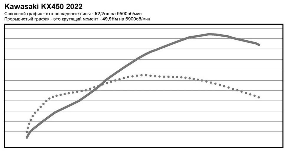 Вот пример: кроссовый флагман Kawasaki KX450, более чем конкурентоспособный на реальной трассе, ощутимо уступает большинству однокласснико на диностенде. Его 52,2лс на 9500об/мин обгоняют только Suzuki RM-Z450 2022, а по пиковому значению крутящего момента (49,9Нм на 6900об/мин) KX является по сути аутсайдером наряду с Yamaha YZ450F 2022.