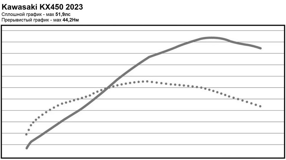 В этом году тенденция не изменилась: четырёхтактный двухверхневальный инжекторный двигатель Kawasaki KX450 2023 года с жидкостным охлаждением и рабочим объёмом 449куб.см на диностенде выдал 51,9лс и 44,2Нм тяги.