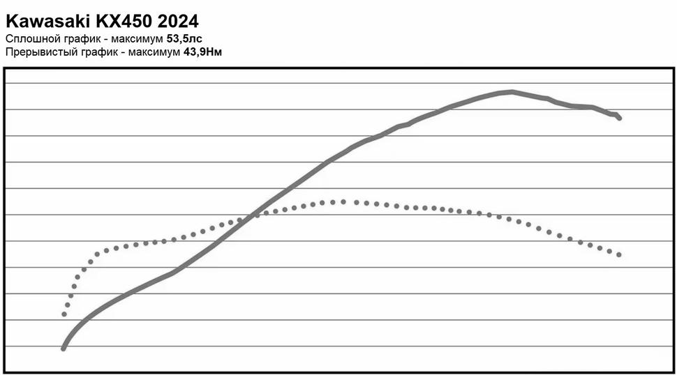 Небольшой воздушный короб и задушенный по экологии глушитель делают модель 2024 года значительно более мягкой и спокойной, чем предыдущие поколения, но хорошая новость состоит в том, что двигатель KX450 обладает выраженным верховым характером и раскрывается после 9000об/мин. Что касается пиковых показателей, то Kawasaki KX450 2024 года выдал 53,5лс и 43,9Нм с заднего колеса, что на 1,6лс и 0,3Нм меньше, чем модель 2023 года.