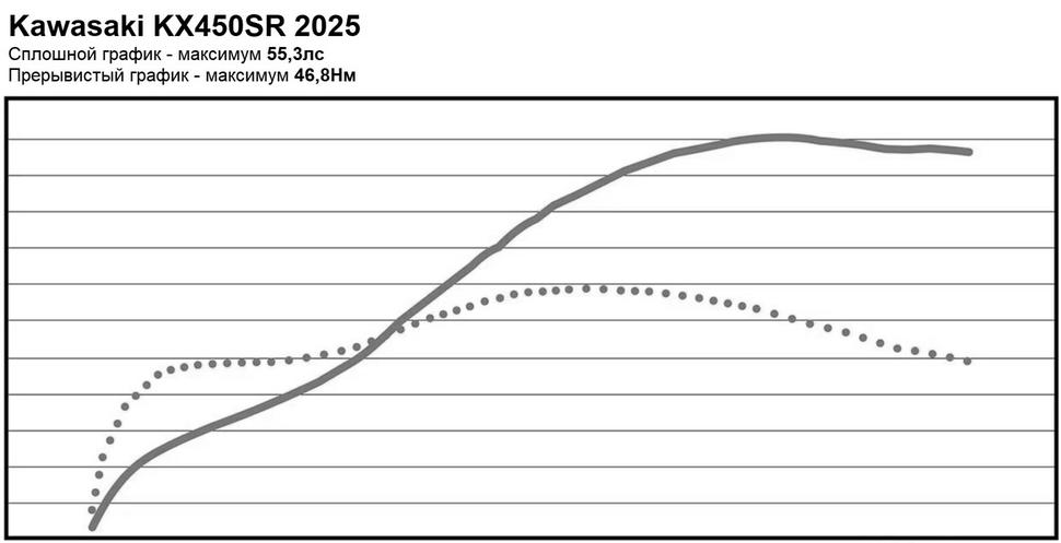 При этом характеристика двигателя KX450SR не имеет провалов и затыков - он мощно и резво откликается на движения ручки газа. Просто удивительно, насколько эффективно этот двигатель способен работать благодаря нескольким небольшим доработкам.