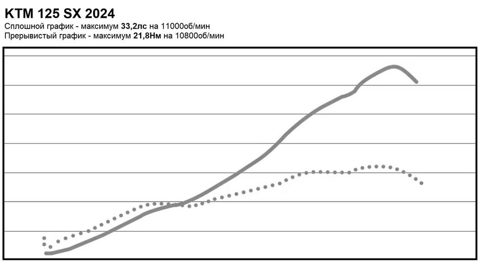Младшая из полноразмерных двухтактных кроссовых моделей, KTM 125 SX 2024 года, на диностенде показала пиковые 33,2лс на 11000об/мин и 21,8Нм тяги на 10800об/мин. Для высокооборотистого и малокубатурного двухтактника 125 SX отличается весьма неплохой тягой на низах, при этом способен потягаться по мощности с некоторыми четырёхтактными 250-ками. А благодаря инжекторной системе питания и мощностному клапану двигатель обладает весьма управляемой характеристикой и линейной кривой мощности.