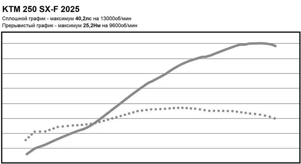 Инжекторный двухверхневальный одноцилиндровый четырёхтактный 250-кубовый мотор с жидкостным охлаждением KTM 250 SX-F 2025 года обладает линейной характеристикой и весьма достойной тягой, в пике выдавая 40,2лс на 13000об/мин и 25,2Нм на 9600об/мин с колеса.